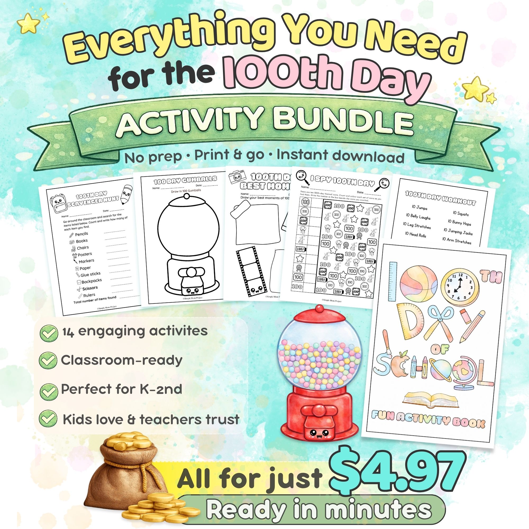 Make your 100th Day of School celebration easy, meaningful, and fun with this low-prep printable bundle! Designed for busy teachers and parents, this pack includes 14 engaging activities that blend math, writing, crafts, and movement—so every child can participate and succeed.