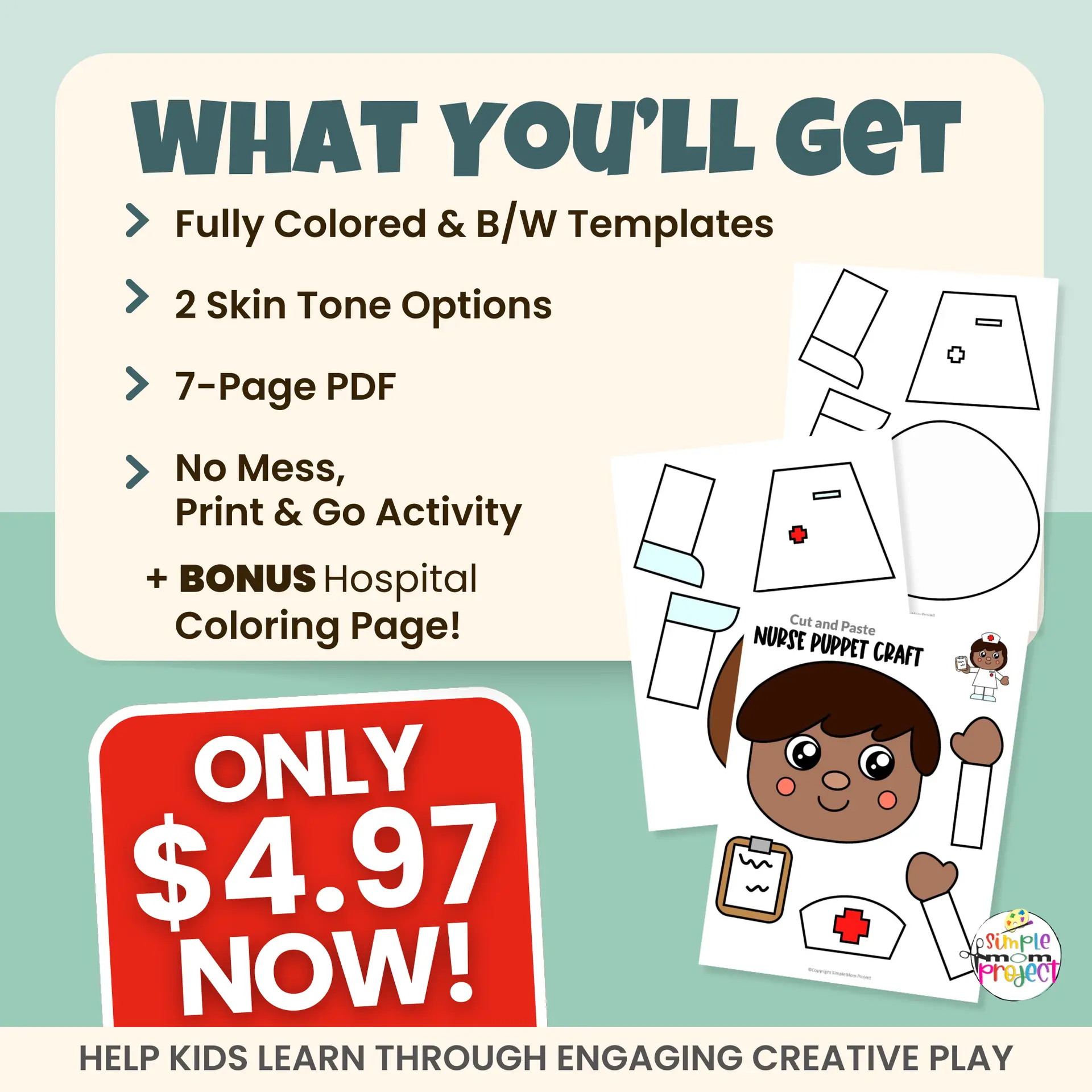 With print-and-go templates, children can cut, glue, and create their own nurse puppet for dramatic play, storytelling, and social-emotional learning.