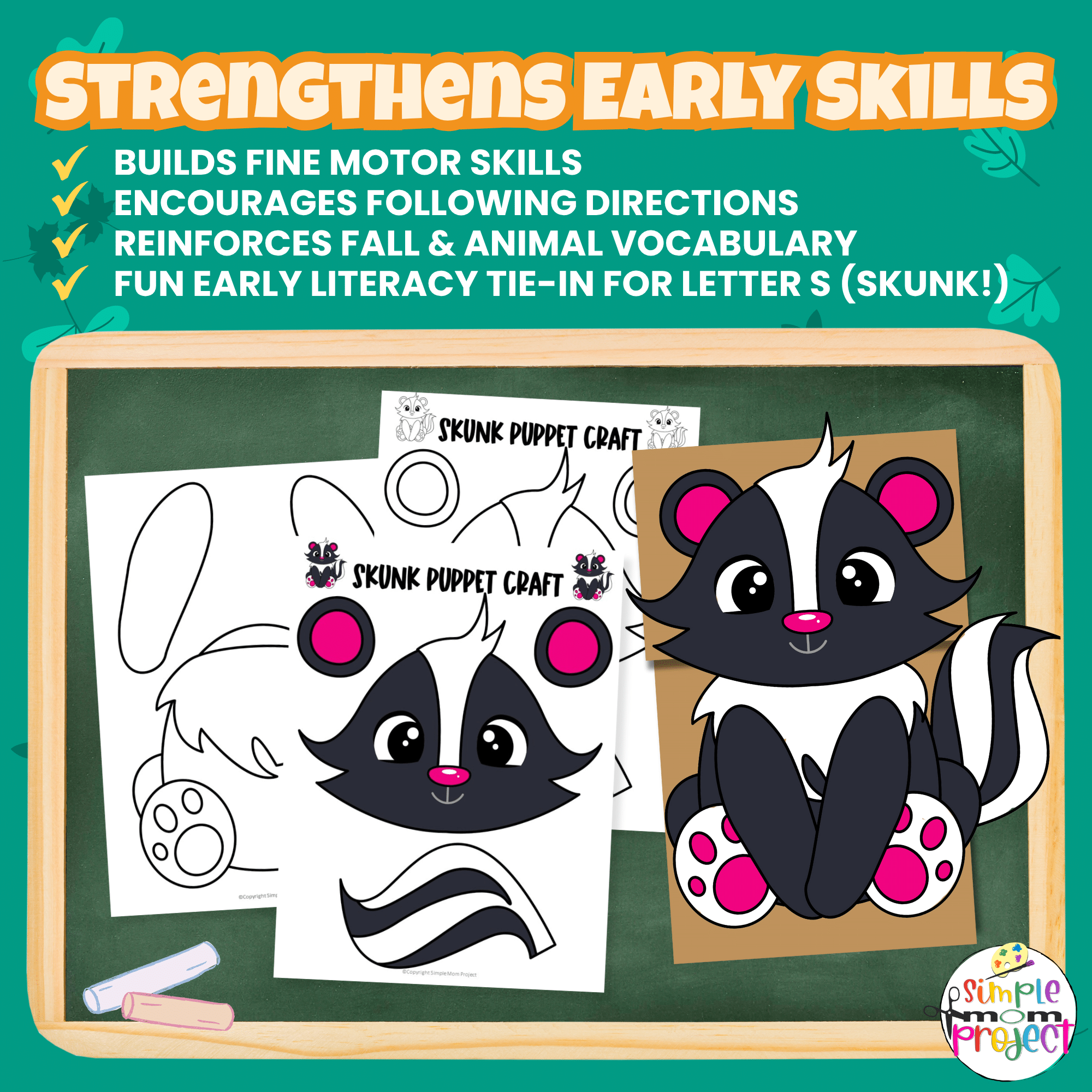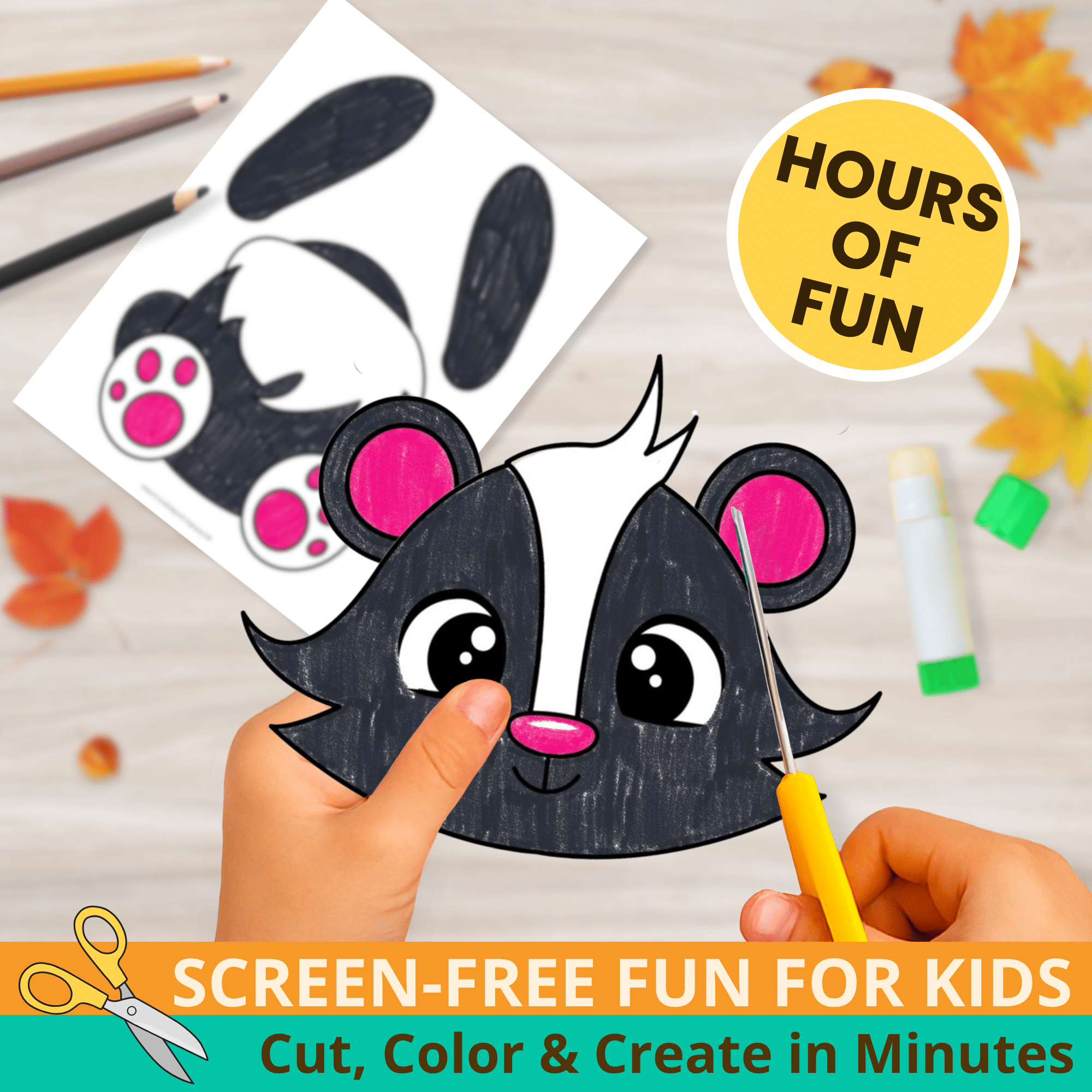 Kids can practice fine motor skills, cutting, and creativity while bringing their silly skunk to life through storytelling and pretend play.